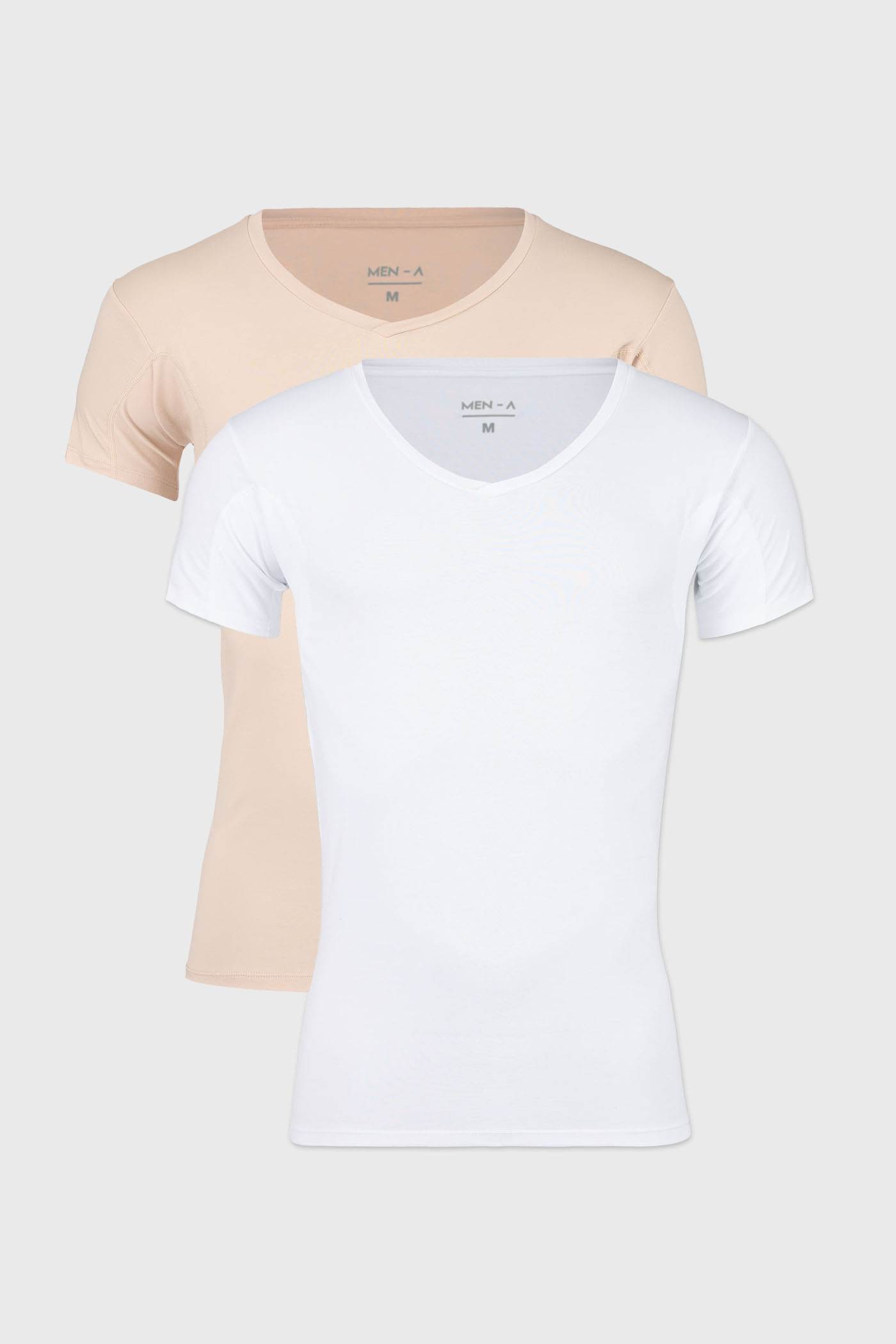 Изгодна опаковка невидими тениски за под риза MEN-A с платки под мишниците. Тениските са с абсолютно плоски шевове и затова не се очертават под облеклото. Благодарение на подсилената част в областта под мишниците съвършено предпазват от появата на петна от пот. Създадени от нашите специалисти от Astratex за Вашия комфорт.