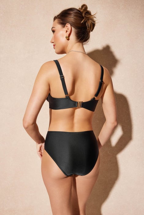 Бански костюм от две части Sateen Sheen Black I в елегантен черен цвят. Бандо горнището с подвижни презрамки ви осигурява свършен тен. Чашките са с подвижни подплънки за индивидуално дооформяне на бюста, средата е от метална катарама. Горнището е допълнено с класическо долнище с по-висока талия. Банският е създаден от специалистите на Astratex от луксозна материя с вид на сатен.