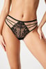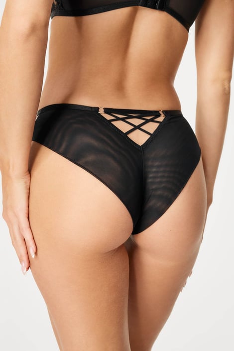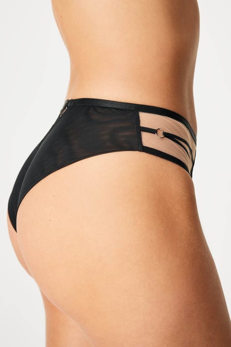 Бразилските бикини Kelly с по-висока талия изтънчено комбинират ненатрапчив тюл, който създава илюзията за голо тяло и дантела със strappy ленти. Дупето е обвито и оптически оформено от черна мрежеста материя, украсена с ефектен отвор.