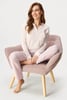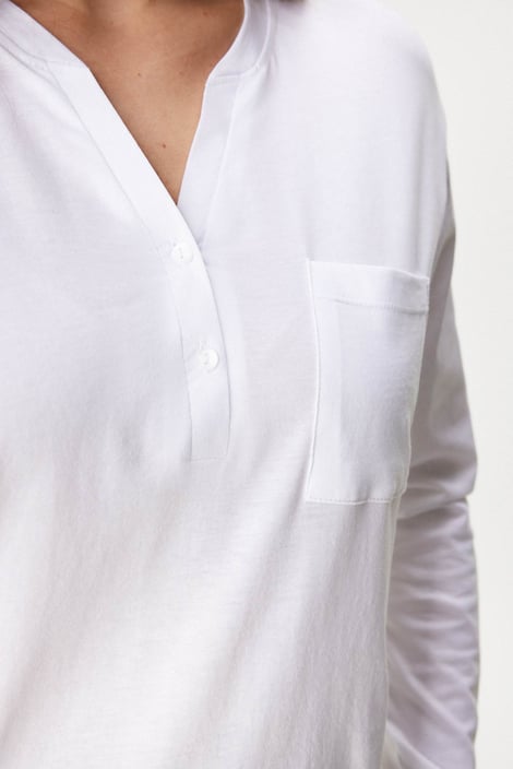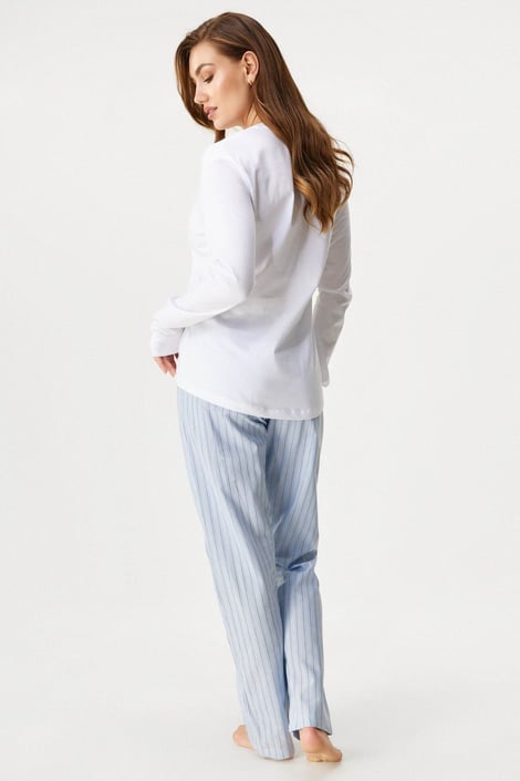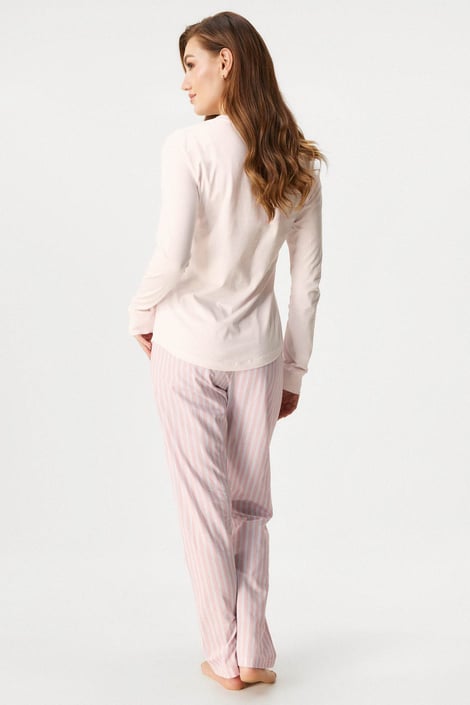 Дамска памучна пижама Alia с елегантен дизайн. Едноцветното горнище от меко трико е украсено с копчета по деколтето и джобче на гърдите. Дългите ръкави завършват с маншети. Долнището е от раирана тъкан с ластик в колана.