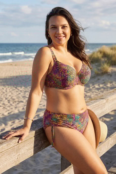 Горнището на бански костюм Bella Soft предлага комфорт на големия бюст. Просторните чашки с T-образна кройка му осигуряват не само надеждна опора, но и желаната форма. С нетрадиционен цветен животински мотив.