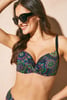 Горнище на бански костюм Mya с пъстроцветна неонова щампа. Подплатените чашки отпред са украсени с ефектно кръстосване. Подвижните Push-Up подплънки се грижат за съвършеното повдигане на бюста.