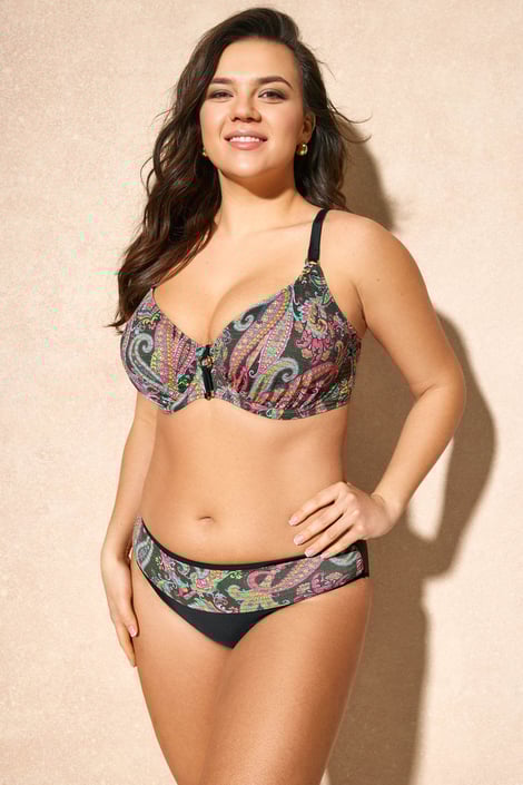 Горнище на бански костюм Safa с орнаментална щампа и черни презрамки. Неподплатените но плътни чашки оформят бюста и надеждно го държат на мястото му и в бурното море. Прошито със златна нишка.