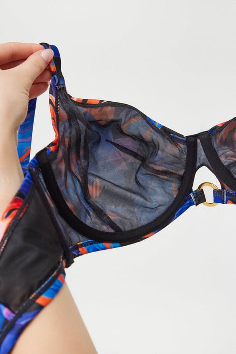 Горнище на бански костюм Vybe с ярка щампа за дами с всякакъв размер. Чашките с банели са неподплатени и осигуряват естествена форма на бюста. Средата е украсена с отвор със златна халкичка. Презрамките с регулация на дължината на задната страна могат да се свържат.