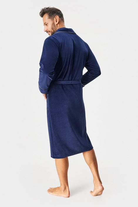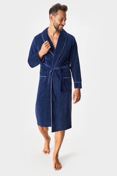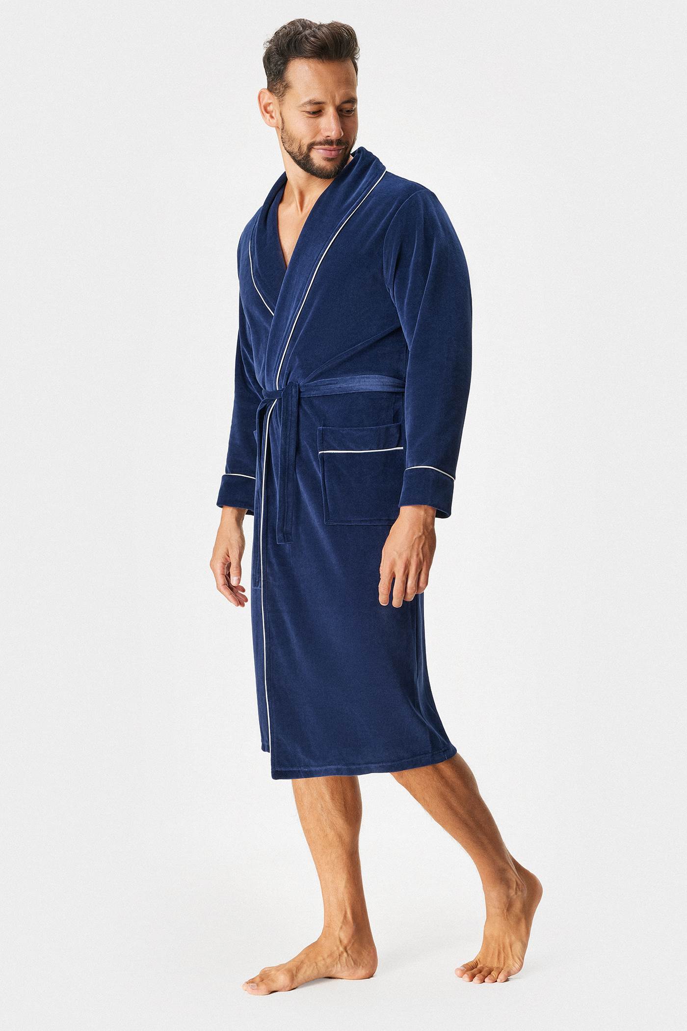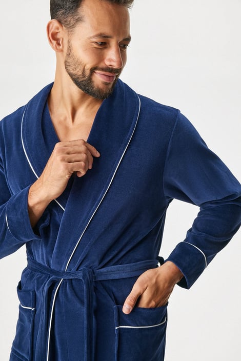 Елегантен и удобен. Ще обикнете памучния халат Oskar благодарение на кадифената материя. С практични връзки в колана. Ръкавите, реверите и джобовете са обшити с бяла контрастна лента.