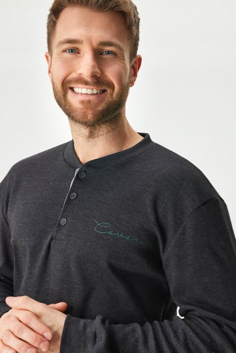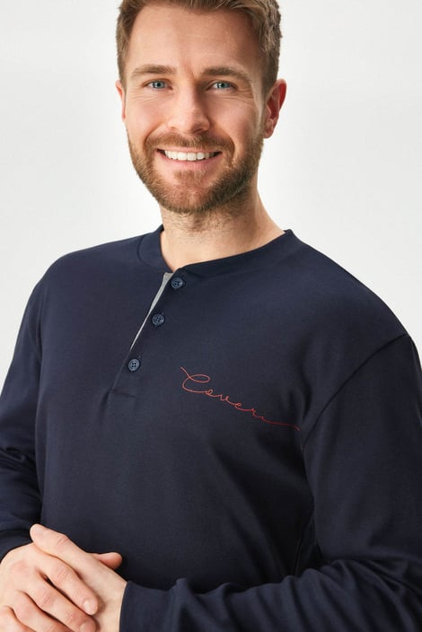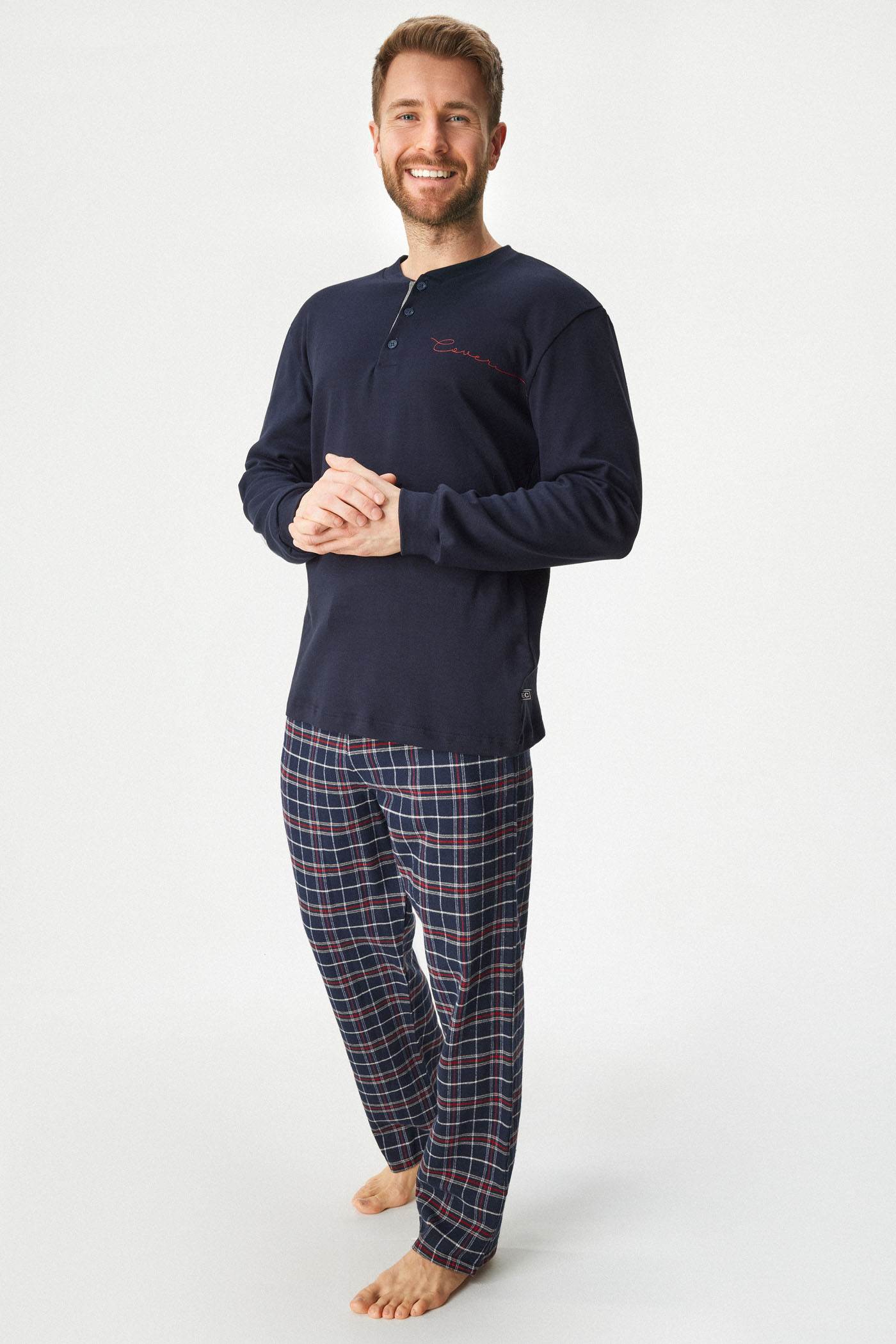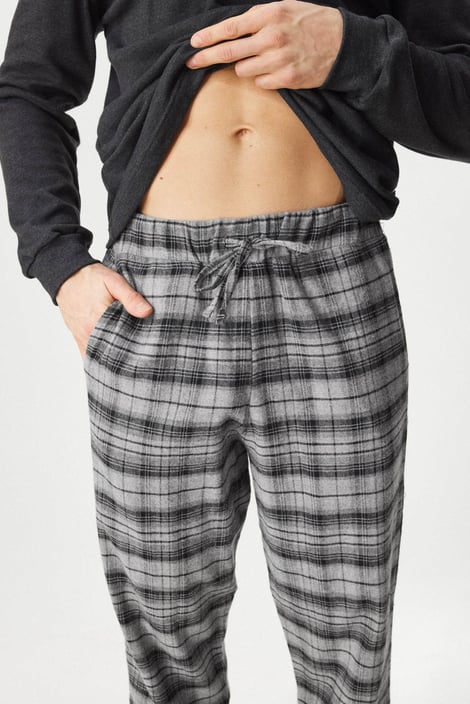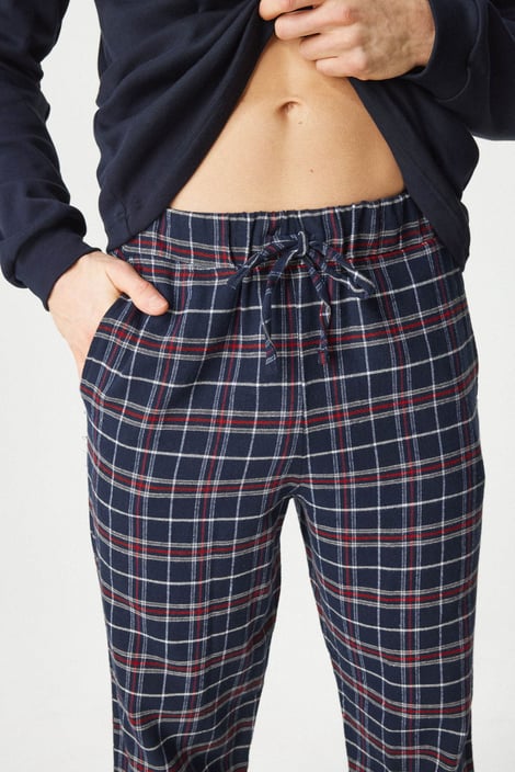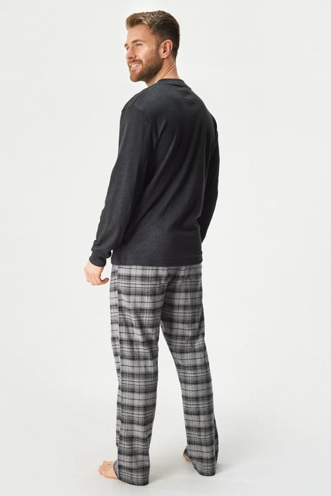 Памучната пижама Kristopher, изработена от меко трико, ще ви осигури перфектен комфорт. Едноцветното горнище с дълъг ръкав е декорирано с копчета на деколтето. Карираното долнище има ластик в колана и връзка за пристягане, както и практични джобове отстрани.