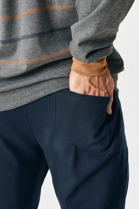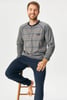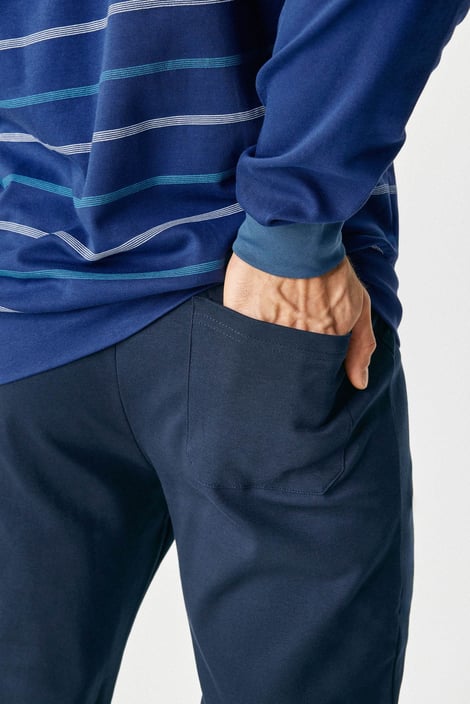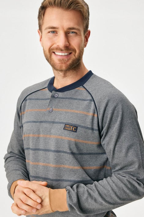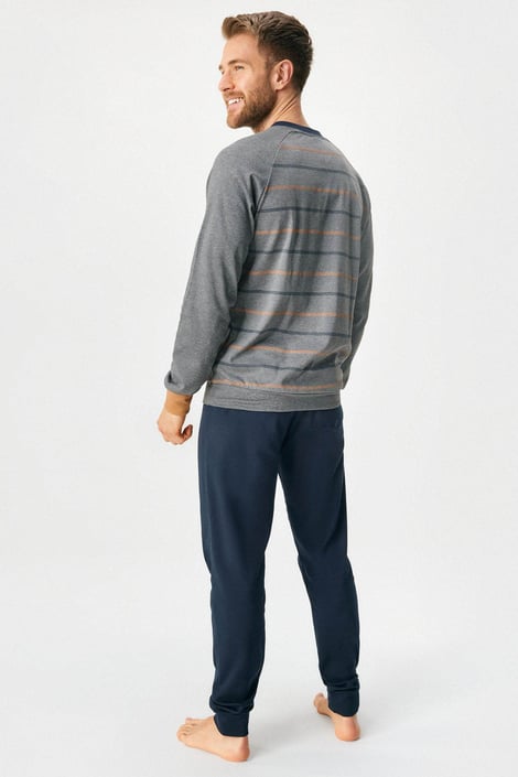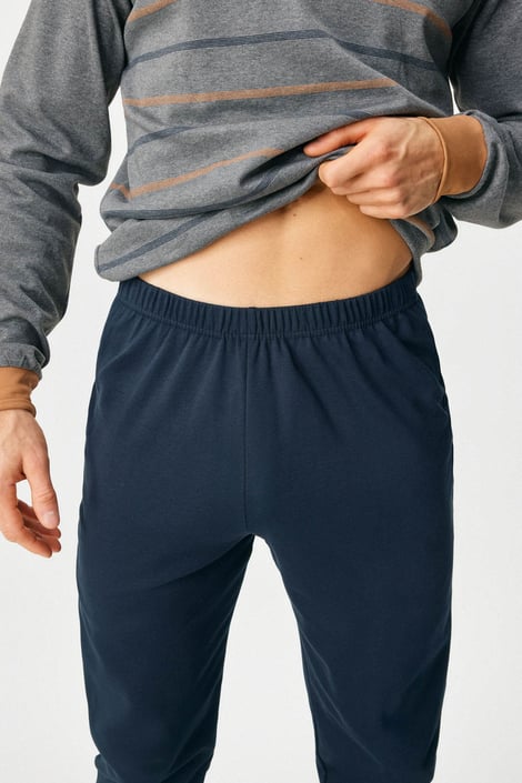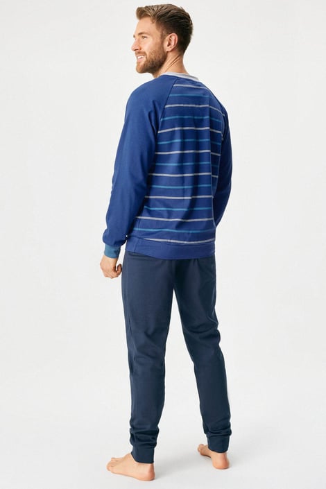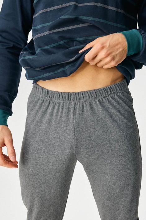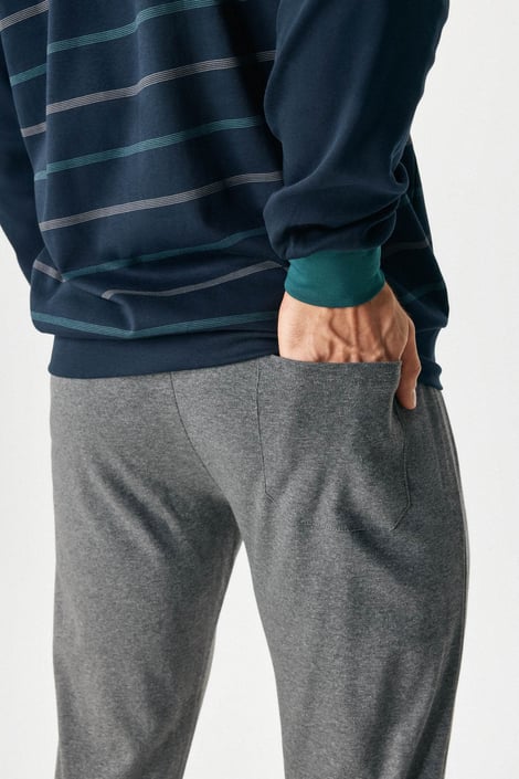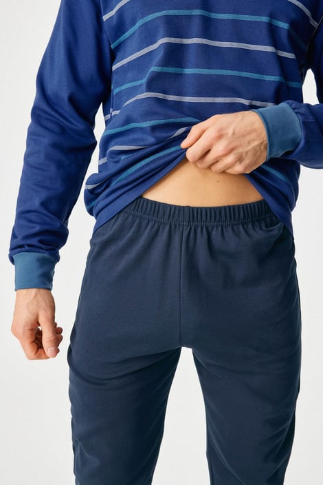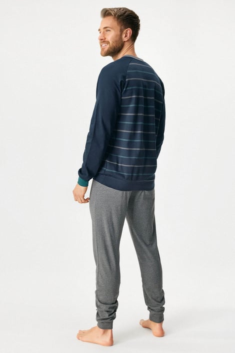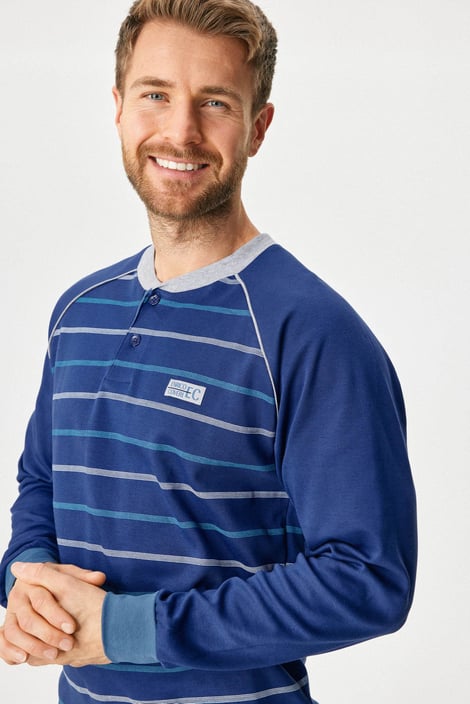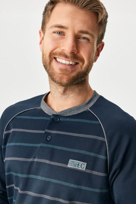 Памучна пижама Dean, изработена от меко трико за Вашия спокоен сън. Горнището с дълъг ръкав е с щампа на фини райета, дългото долнище е едноцветно. Краищата завършват с маншети.