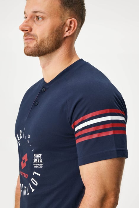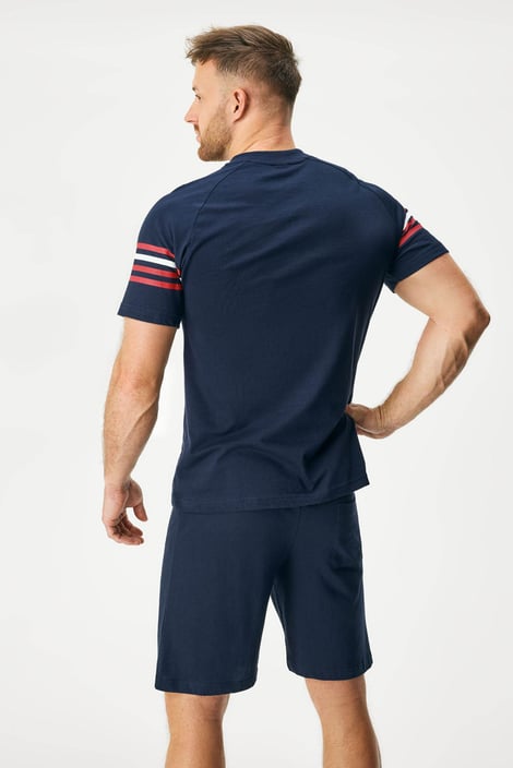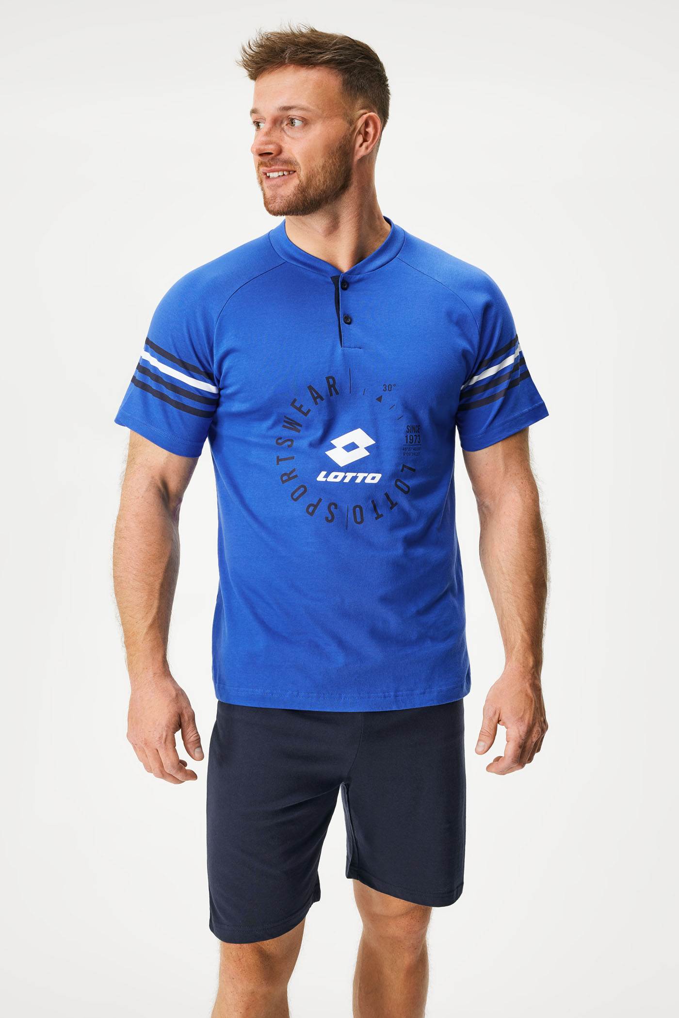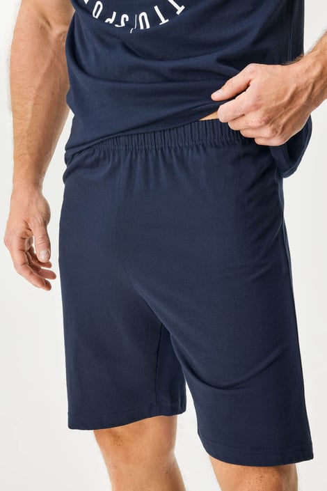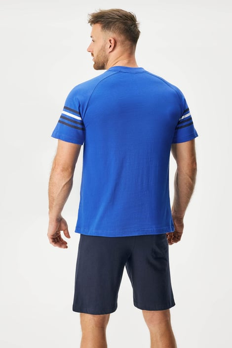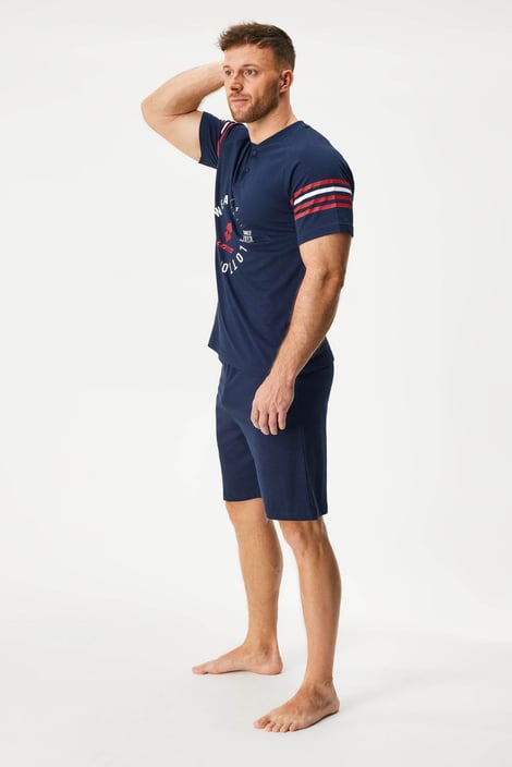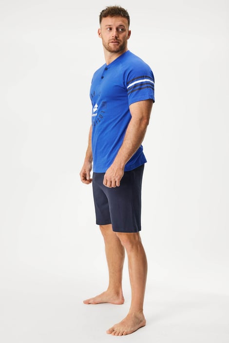 Пижамата Zander комбинира горнище с къс ръкав и шорти. С щампа на ръкавите и гърдите, деколтето е с копчета. Мекото памучно трико е гаранция за спокойно спане.
