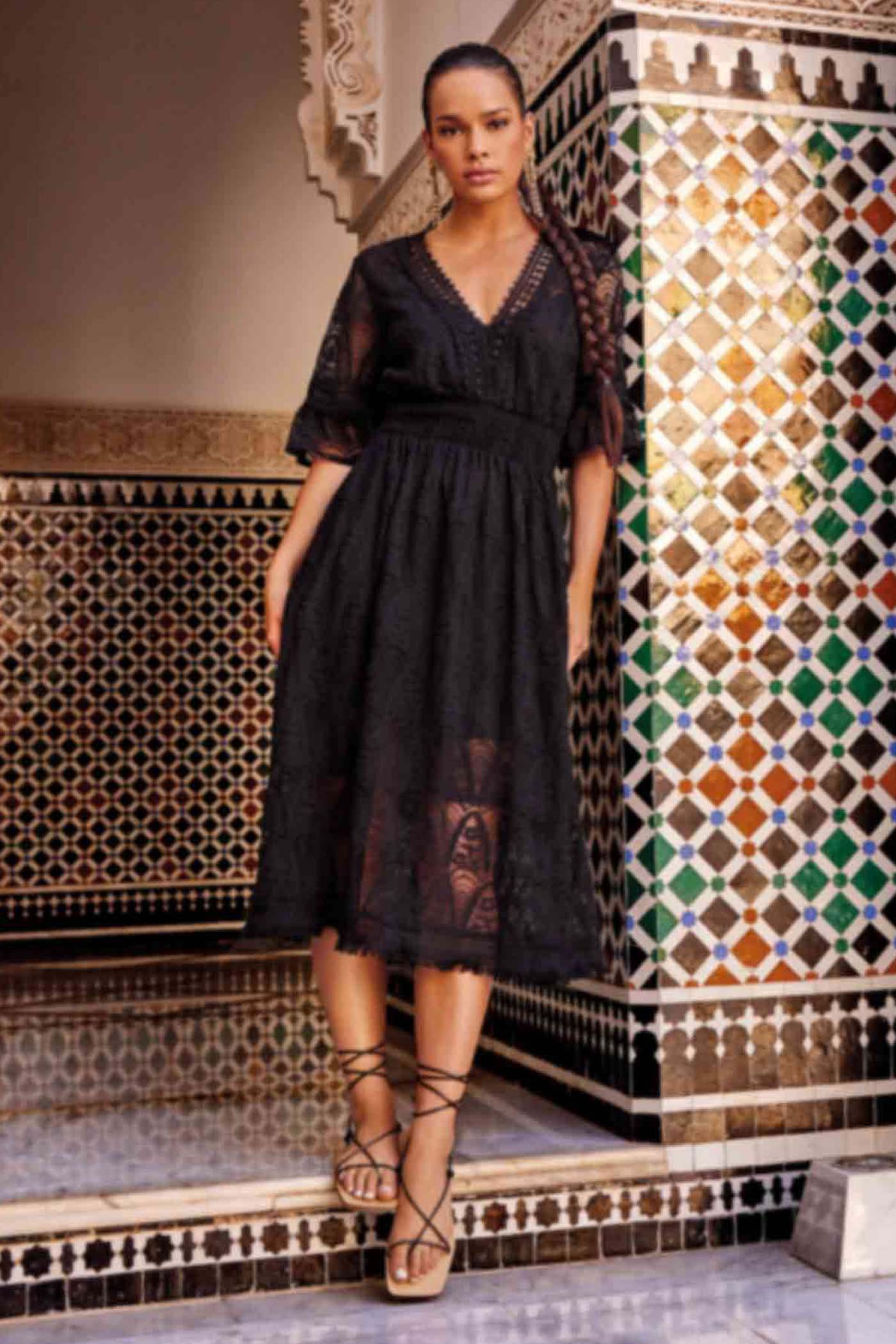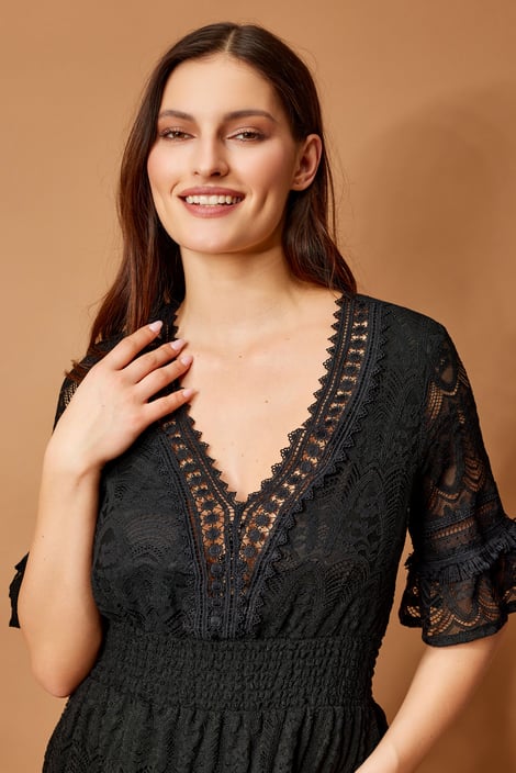 Плажната рокля Iconique Celine украсява Вашите форми с богата флорална дантела. Ръкавите са украсени с нежни волани, долният кант с фини ресни.
