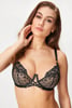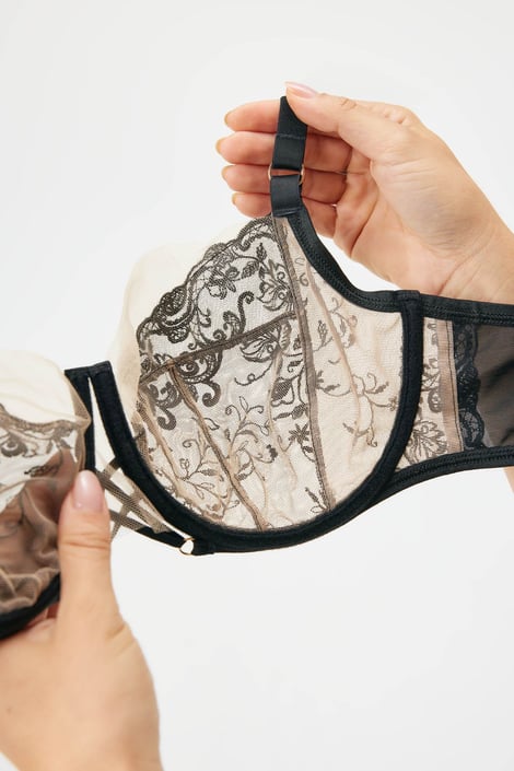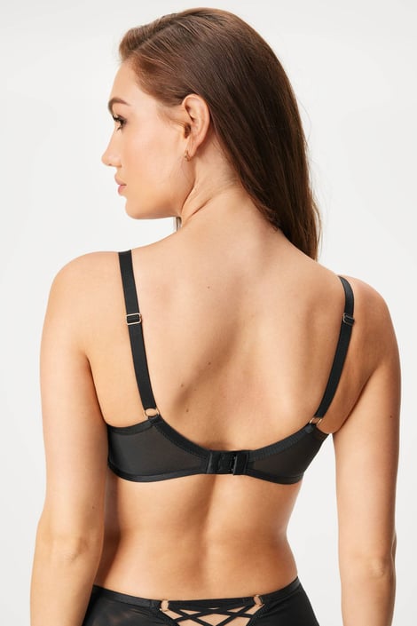 Сутиенът Kelly изтънчено комбинира ненатрапчив тюл, който създава илюзията за голо тяло, с черна дантела. Кройката с неподплатени чашки с банели естествено оформя и осигурява опора и на по-големия бюст. Високата среда е украсена със strappy ленти. Обиколката отзад е от фина мрежеста материя.