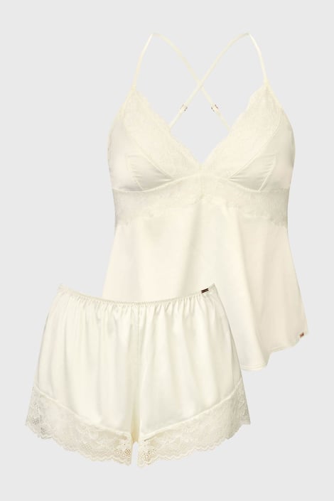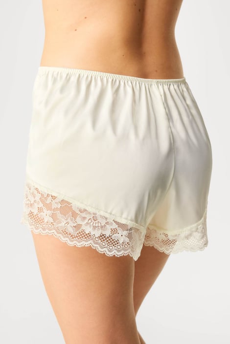 Луксозните пижамени шорти Lyra от свободно падащ сатен са допълнени с дантела на крачолите. Комбинират се идеално с нашия сватбен дантелен потник.